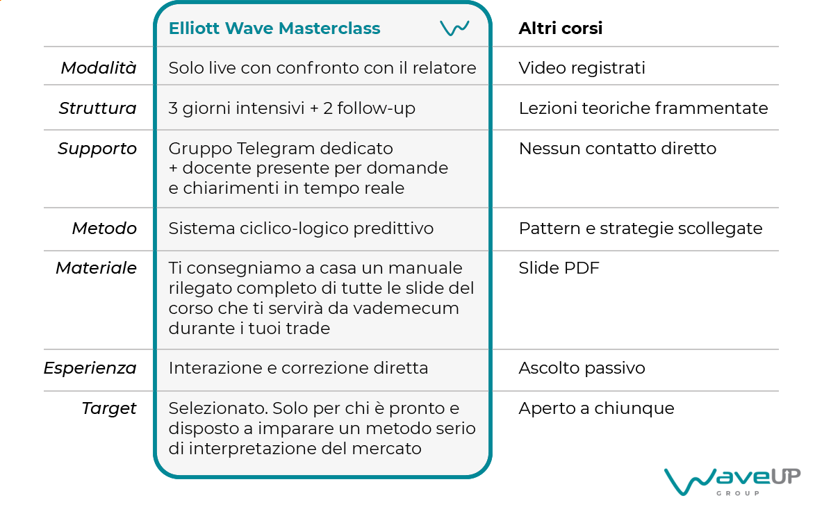 Elliott Wave Masterclass è il corso live che ti insegna a leggere il mercato in tempo reale. Noi, non ti diamo segnali operativi, ti insegniamo a cercarli!